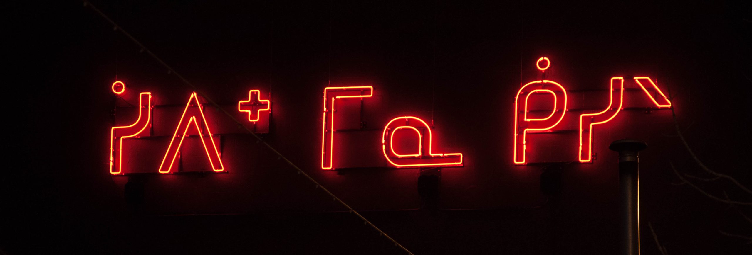 Installed in 2017, River and Sky is a neon light piece which says “nipiy mîna sîpiy” in Cree syllabics. This phrase means “river and sky” in English and is pronounced “SEE’-pee MEE’-nuh KEE’-sik.” This piece is owned by the City of Saskatoon as part of the Placemaker Program, which aims to add significance to civic spaces and engage with audiences to promote an appreciation for contemporary art practices. River and Sky is the sister piece to Land of Berries, located on the north side of Persephone Theatre.