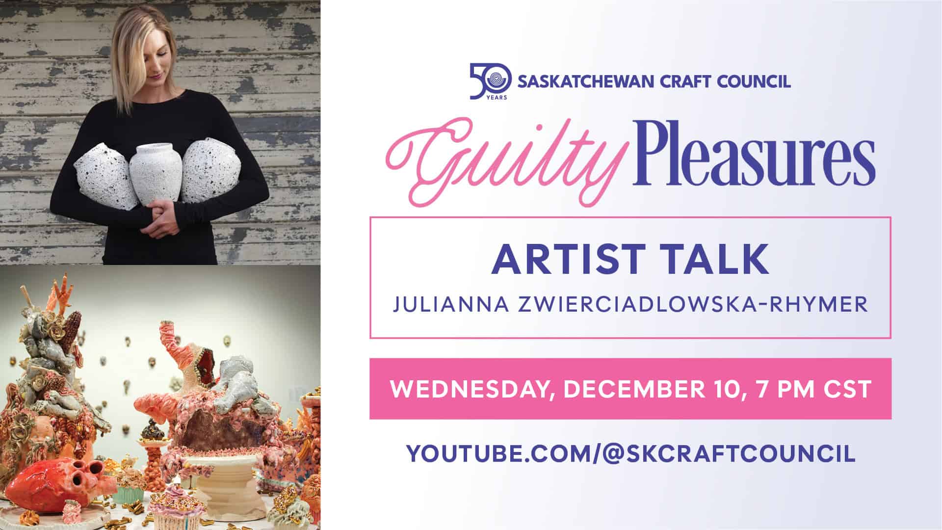 Saskatchewan Craft Council Presents: Guilty Pleasures By Julianna Zwierciadlowska-Rhymer November 8, 2025 - January 17, 2026 Opening Reception November 8 | 2 PM Manitoba artist Julianna Zwierciadlowska-Rhymer creates luscious and luxurious ceramic cakes and desserts to explore food production and consumption within the Western World. Elaborate detail and extravagance seduce the viewer but reveal a disturbing […]