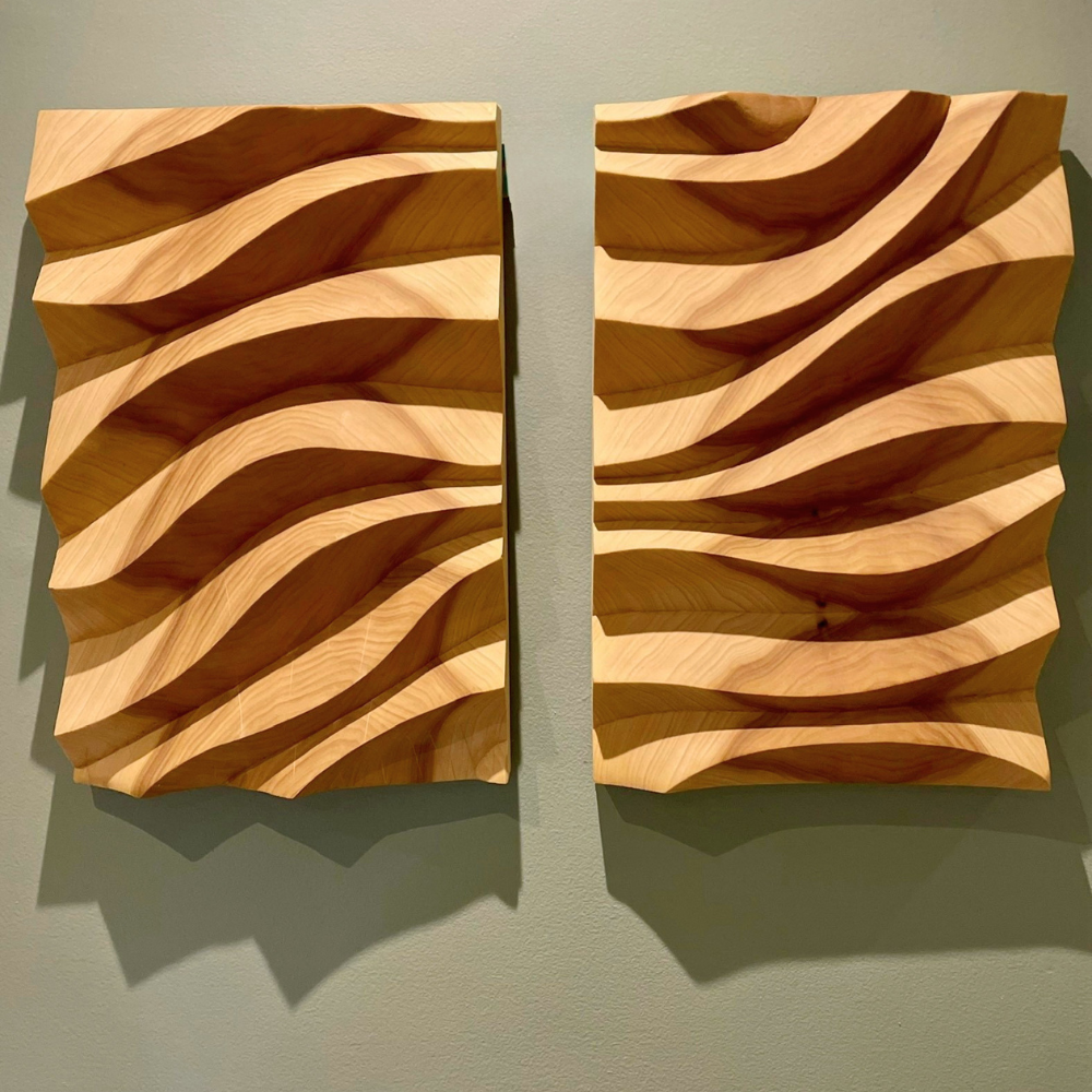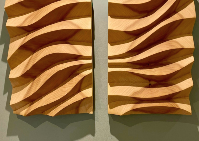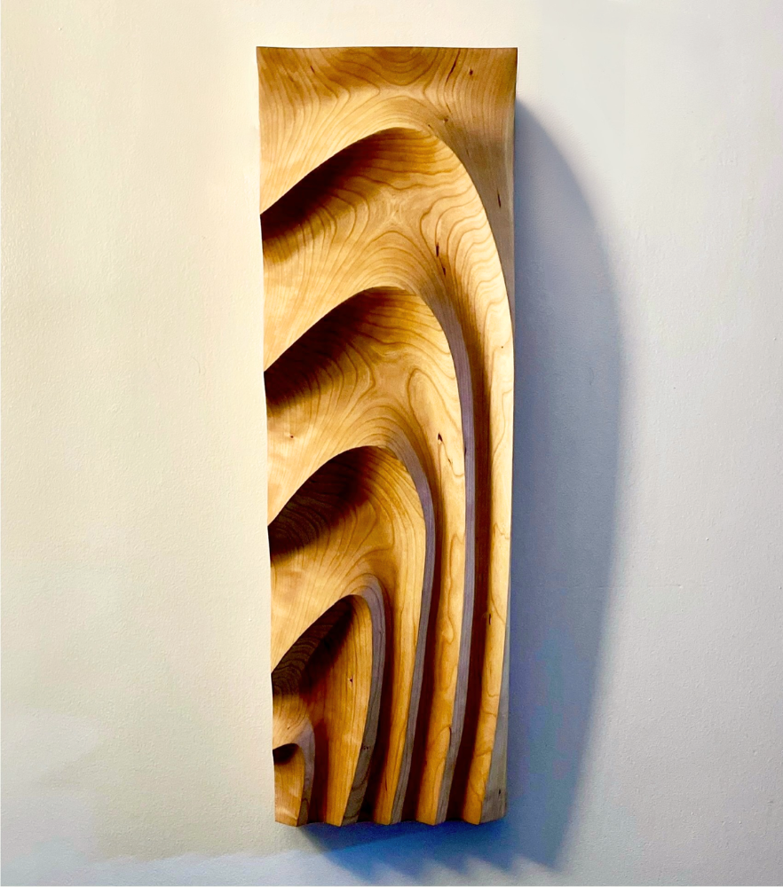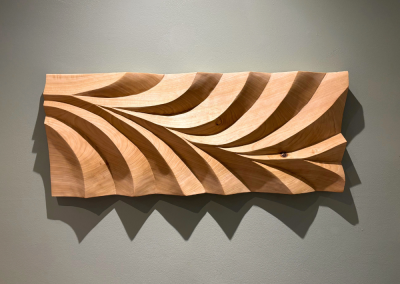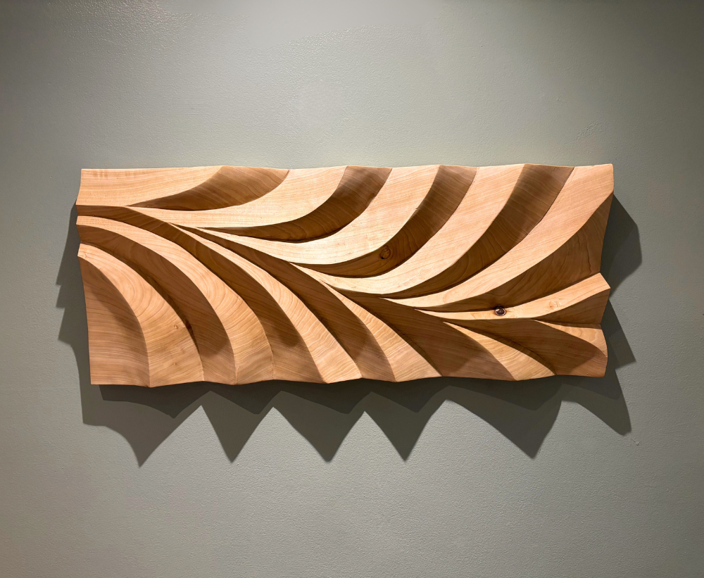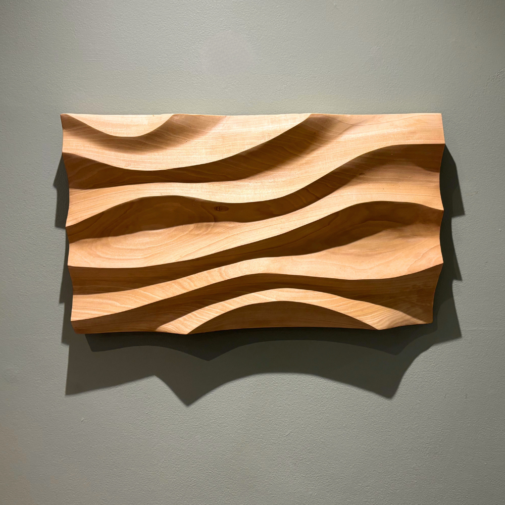 Lepage’s signature body of work, Groove Theory, is an ongoing collection of hand-carved reliefs that explore intuitive geometry and the natural patterns found in the world around us. Drawing inspiration from flowing water, wind-shaped dunes, cloud formations, and the layered textures of forests, each piece is carefully carved to echo organic motion. While the forms are abstract, they remain deeply familiar, inviting viewers to recognize nature’s rhythms translated into wood.