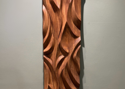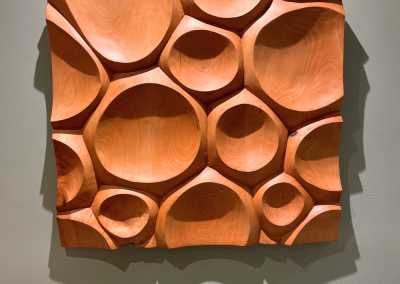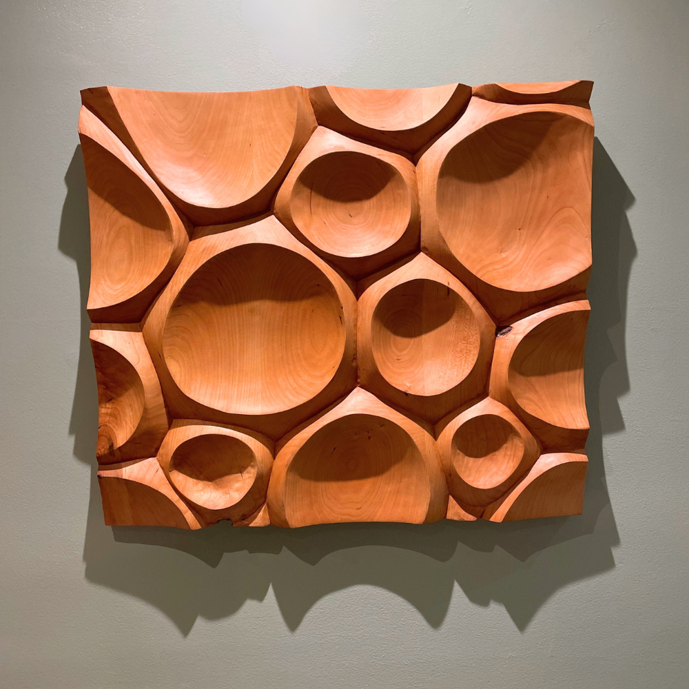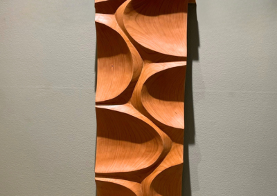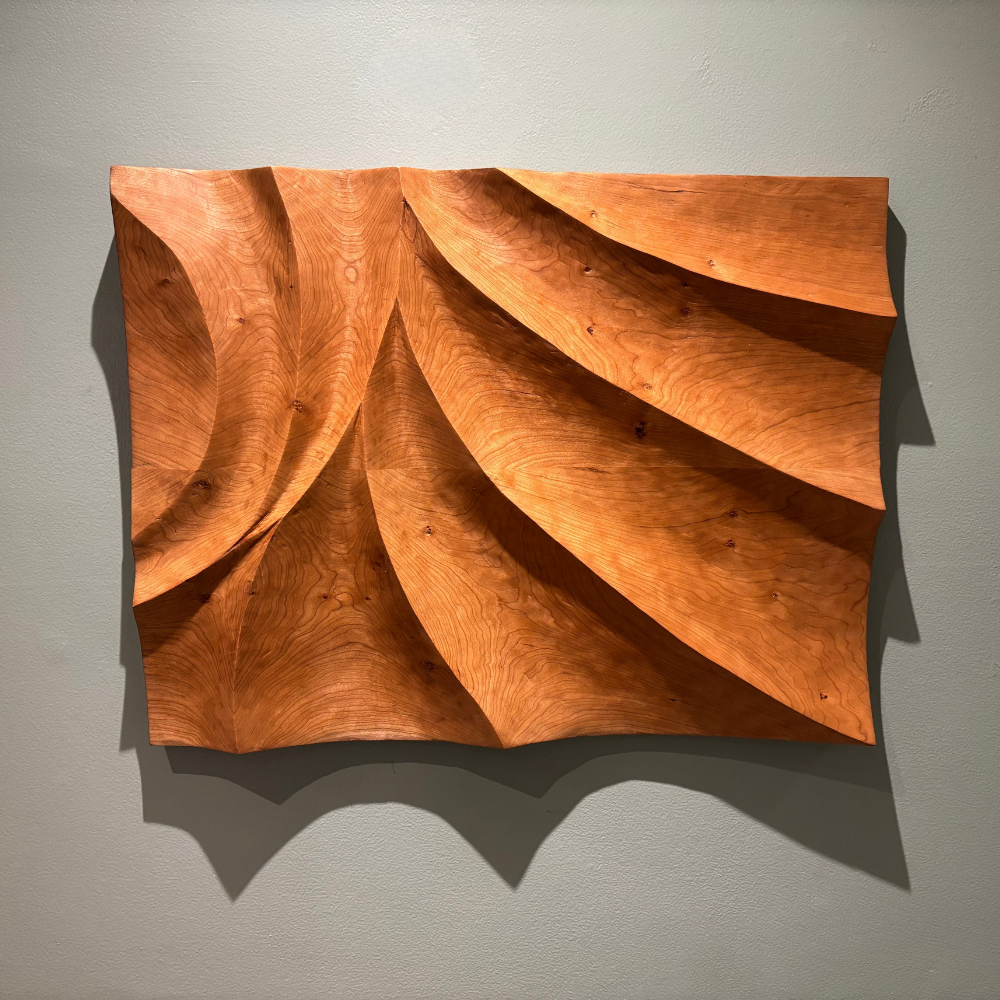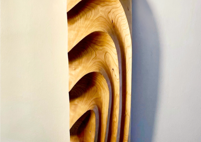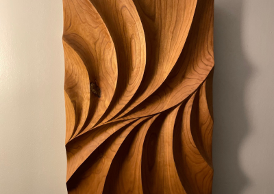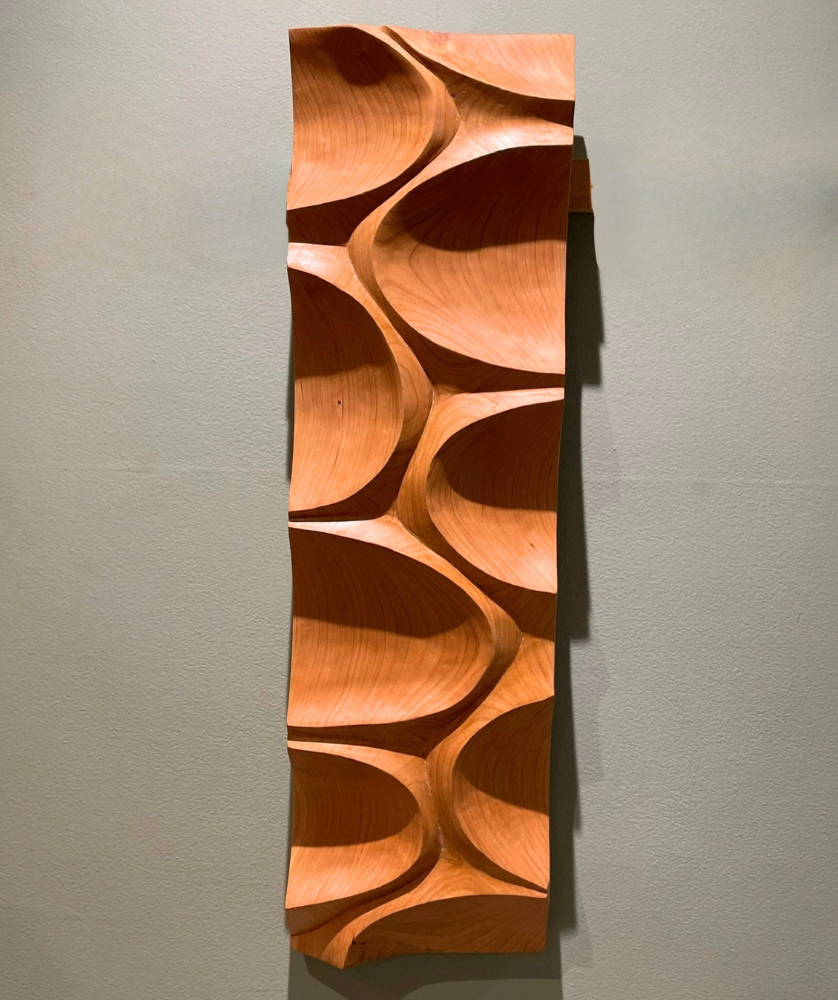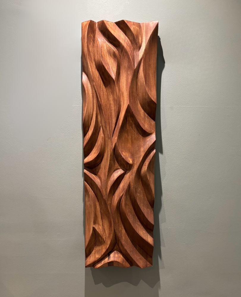 Lepage’s signature body of work, Groove Theory, is an ongoing collection of hand-carved reliefs that explore intuitive geometry and the natural patterns found in the world around us. Drawing inspiration from flowing water, wind-shaped dunes, cloud formations, and the layered textures of forests, each piece is carefully carved to echo organic motion. While the forms are abstract, they remain deeply familiar, inviting viewers to recognize nature’s rhythms translated into wood.