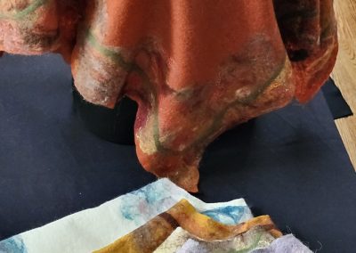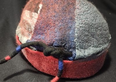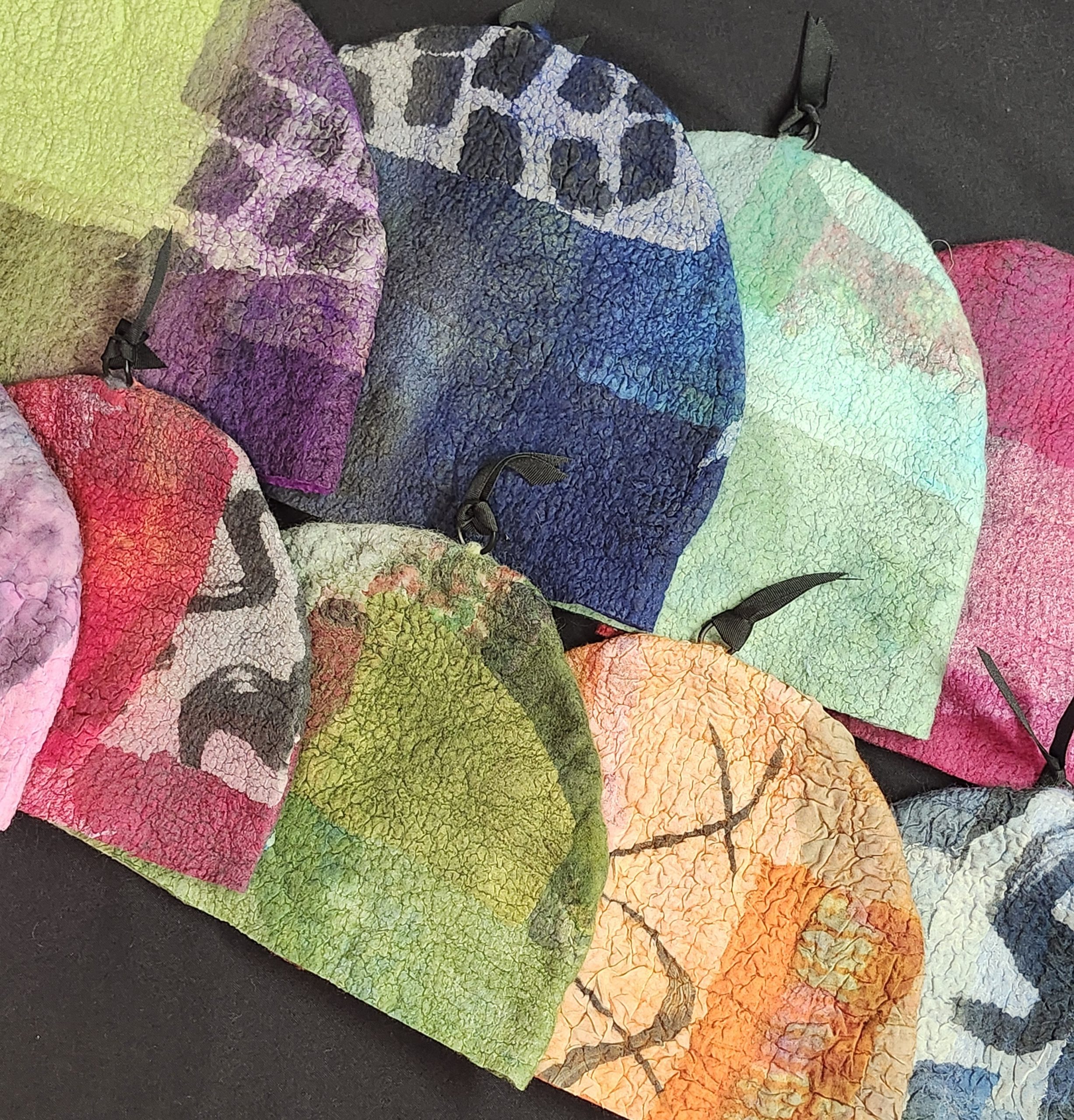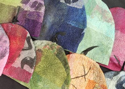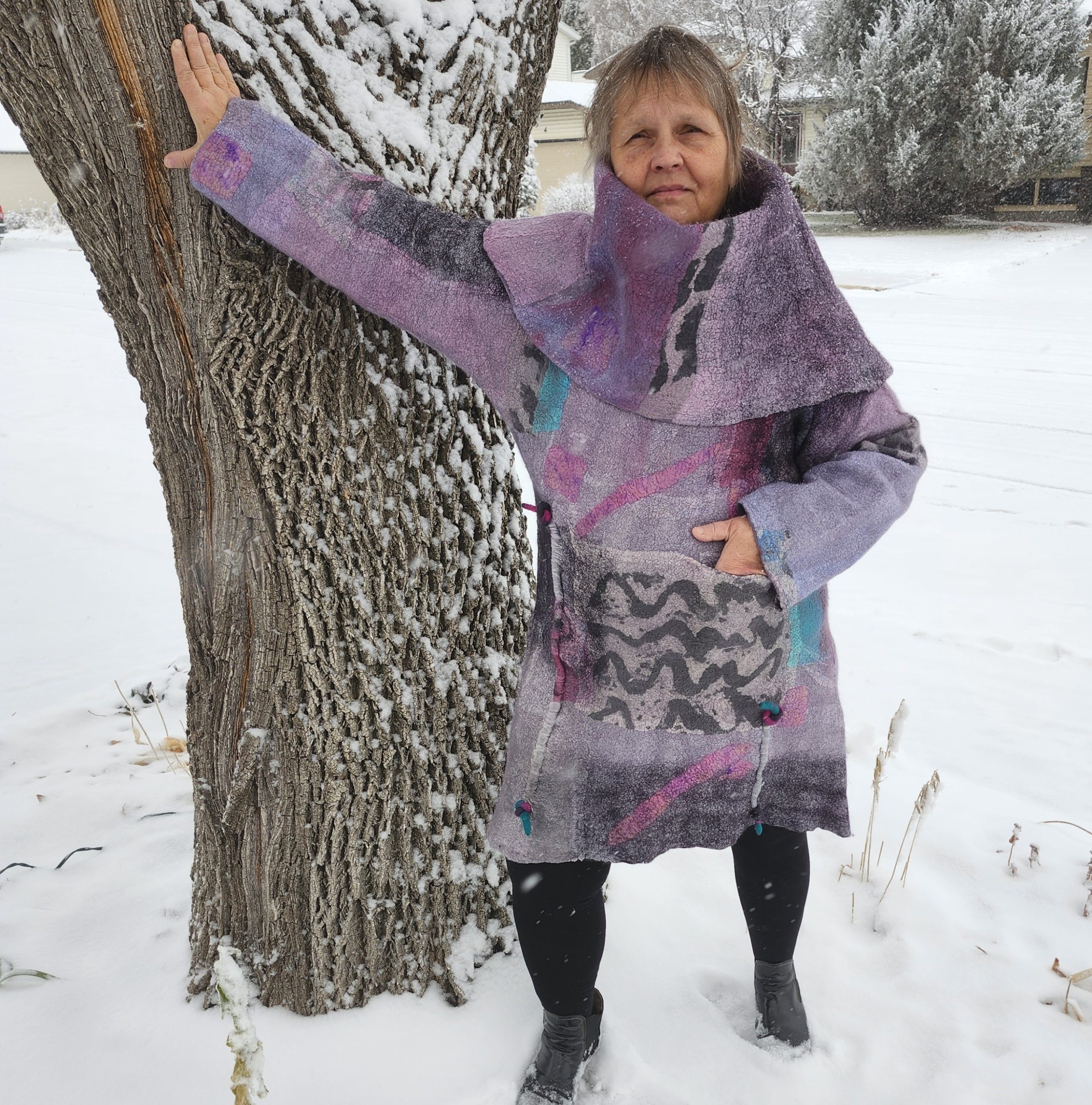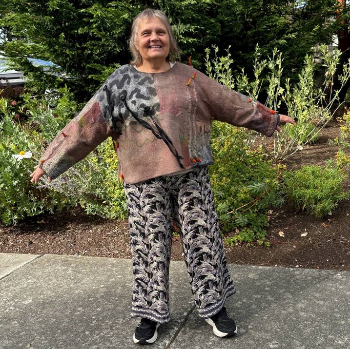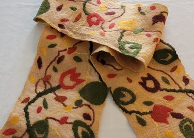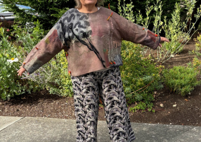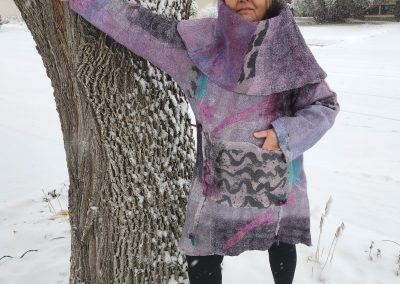 Pam Woodsworth studied fine arts at the University of Saskatchewan before having children and a decades long career as a registered nurse. She has worked in a variety of media: acrylics, watercolours, stained glass, pottery, ceramic sculpture, basket-making, quilting, knitting, crocheting, and weaving. During the pandemic, she wanted to try something new and registered for an introduction to felting. She was immediately smitten with the medium! Since then, she has taken many online and in-class workshops and continues to take delight in finding new ways to explore this art form. She works primarily with merino wool, hand-dyed and hand-painted silks, and Japanese papers. Pam shows and sells her wearable art and home décor work in Saskatoon, her home community, at Handmade House, under the name of Heart Felt Fibre Works.