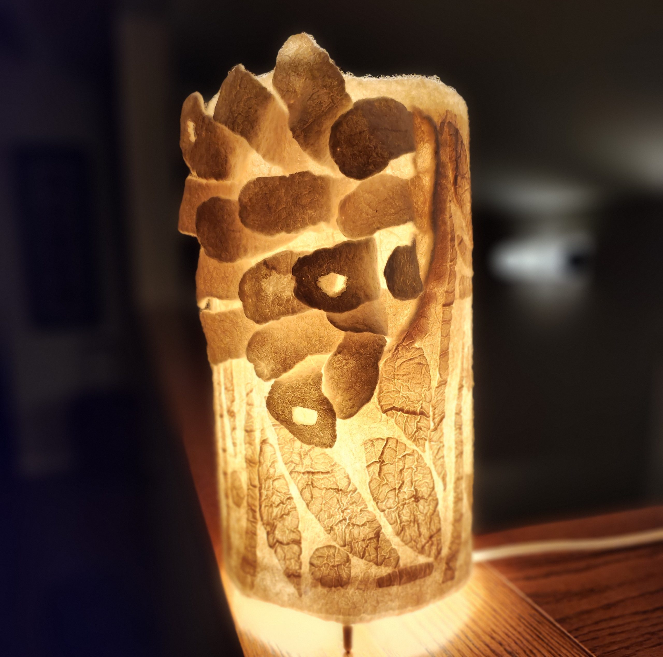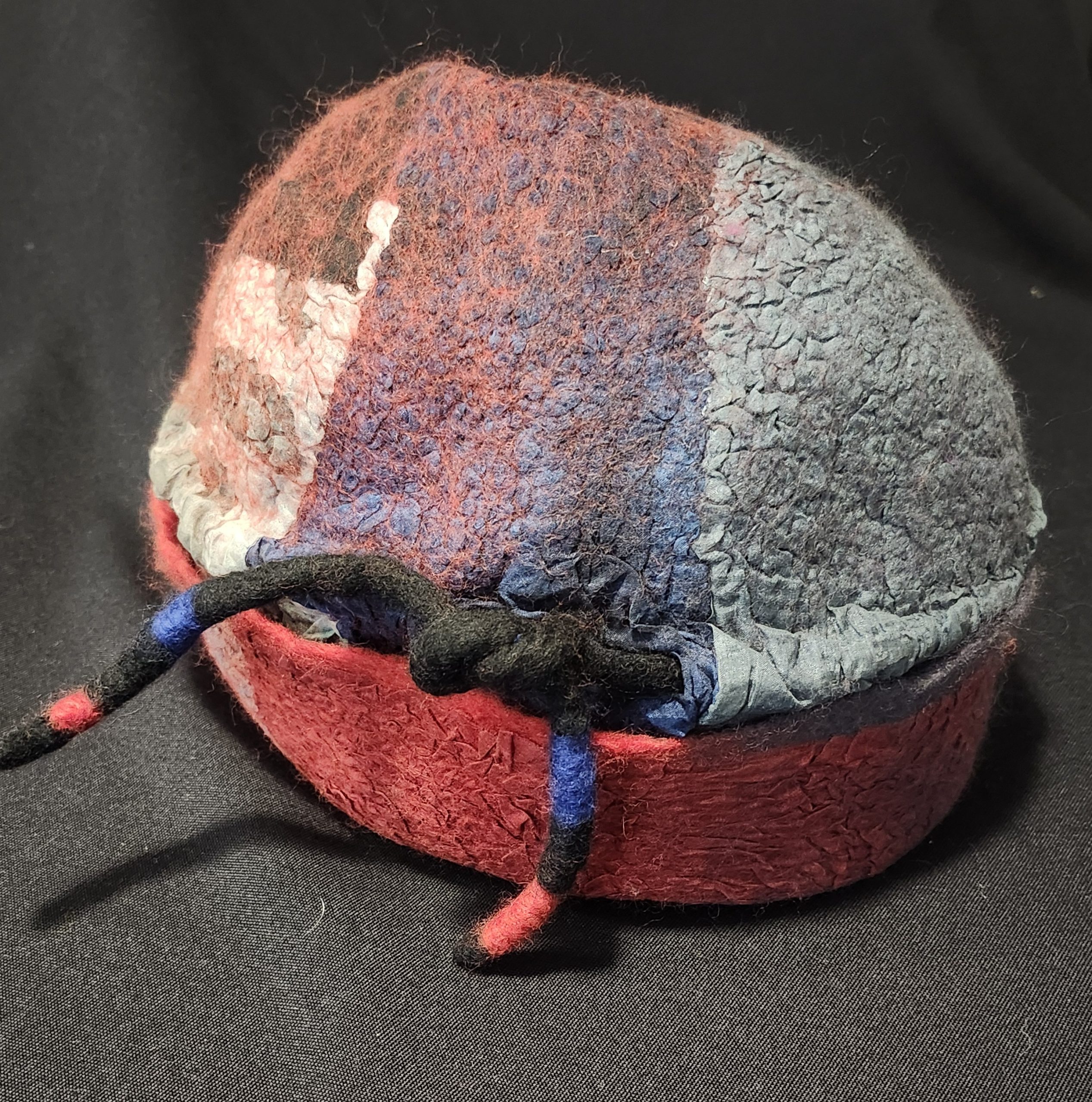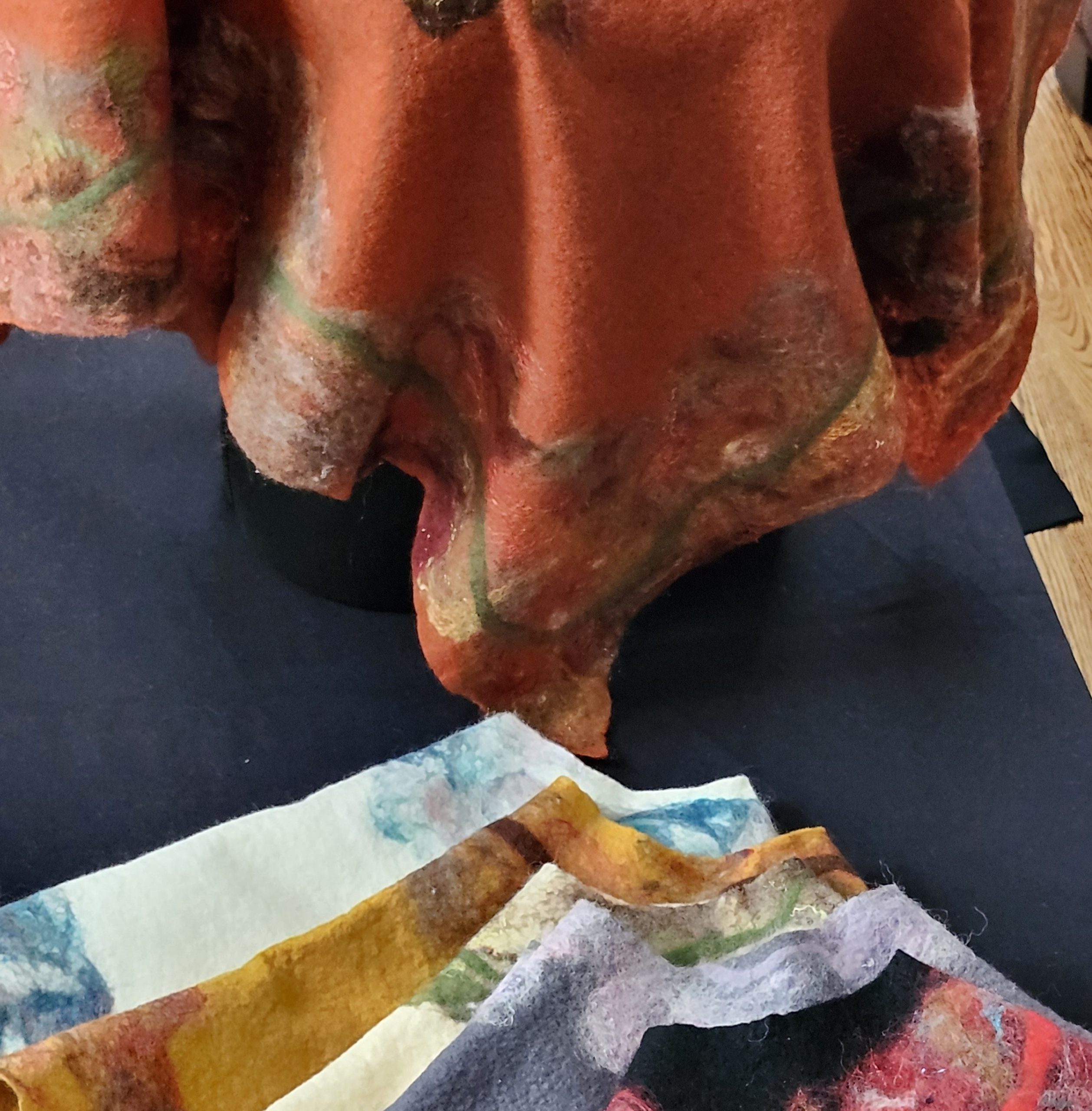 Pam Woodsworth studied fine arts at the University of Saskatchewan before having children and a decades long career as a registered nurse. She has worked in a variety of media: acrylics, watercolours, stained glass, pottery, ceramic sculpture, basket-making, quilting, knitting, crocheting, and weaving. During the pandemic, she wanted to try something new and registered for an introduction to felting. She was immediately smitten with the medium! Since then, she has taken many online and in-class workshops and continues to take delight in finding new ways to explore this art form. She works primarily with merino wool, hand-dyed and hand-painted silks, and Japanese papers. Pam shows and sells her wearable art and home décor work in Saskatoon, her home community, at Handmade House, under the name of Heart Felt Fibre Works.