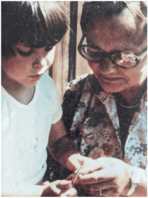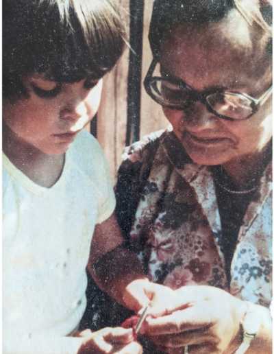 I don’t know what prompted my desire. Perhaps I had been mesmerized by the movement of Grammy’s hands, hands conditioned by the incessant labours of raising a family of eleven on scarce cash and abundant resourcefulness. I too wanted to knit. The fact that my physical coordination lagged behind the force of my will was a surmountable challenge, thanks to Grammy’s patience and Dad’s ingenuity. We sat on that deck for hours as she guided me in manipulating the sawed off knitting needles he creatively reduced to my size.