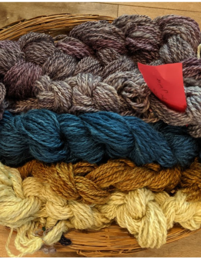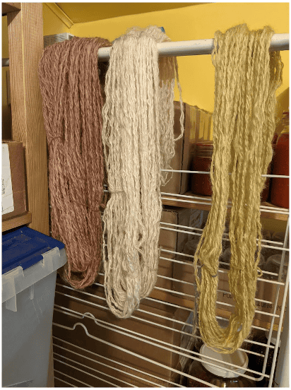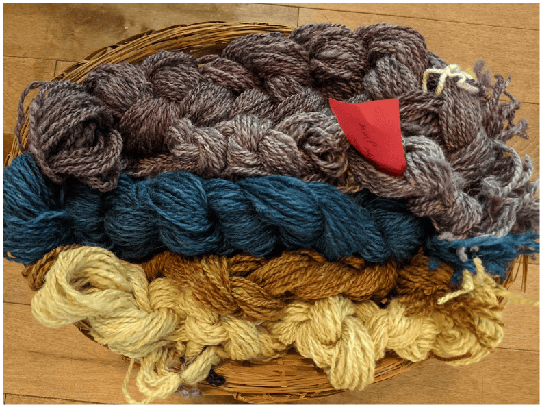 The Spinners and Weavers Guild biweekly spinning afternoons proved a boon for my fleece preparation. This tedious work was less likely to be set aside by the lure of garden projects with a regular date set on my calendar. From there, it was a natural discipline to make time between meetings to spin all that had been prepared. By late spring, all but the final onion-dyed fleece was neatly arranged in spun and plied skeins.