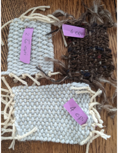 Based on the dimensions of my niddy noddy (skein-winding tool), I calculated the yardage I had spun of each colour and compared that to my required warp length in order to determine how many warp threads each colour would provide. Since my spinning technique had improved since my prototype yarns, I also had to determine whether I needed to adjust the sett. With the help of a borrowed tool, I wove squares of similar weight yarn (I did not want to sacrifice any of my precious dyed homespun!) and decided that the original sett of 6 epi was still appropriate.