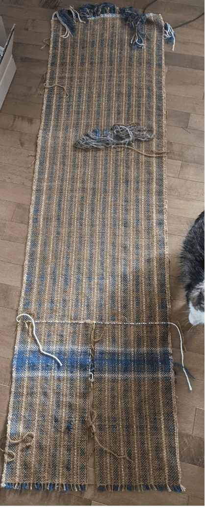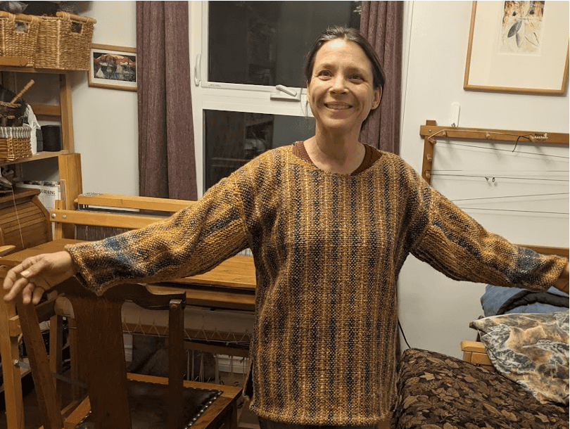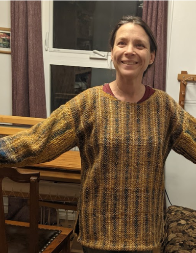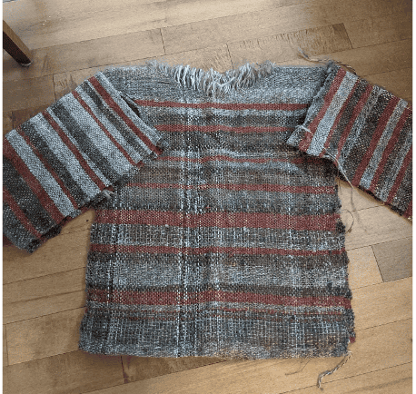 This design would have worked well enough had I not second guessed myself during the weaving and extended the size of the neck opening, resulting in a excessively large neck hole. I also realized (too late) that I should have been working both sides of the neck opening at once and filling the hole in the centre with waste yarn so that I could still properly beat the weaving. As for the wide sleeves, they look fine, but are not very practical. I call it my “Lady of Leisure” sweater, as I am very limited in what I can do while wearing it without the sleeves knocking game pieces out of place or sampling every dish on the table.