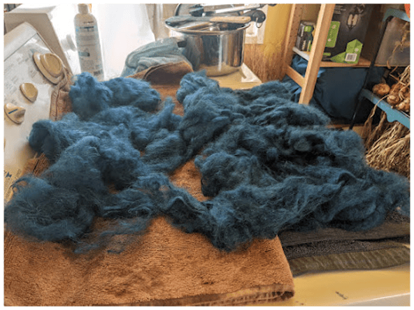 Delightful as the various shades of yellow were, what really got me hooked on dyeing was the fabulous rich blue produced by the leaves of my Japanese indigo plants. I had been advised that dyeing unspun fleece was tricky, but also that Japanese indigo leaves had to be used fresh. Frost was overdue and I didn’t have time to spin. Nor did I have time to attend the indigo dyeing bee Jude had organized; I ended up doing my dyeing the same day but at home, where I could multitask – perhaps beyond the point of wisdom. Nevertheless, the results were spectacular! And the play of light and colour that resulted from the variegation of spinning dyed fleece motivated a spate of further experimentation.